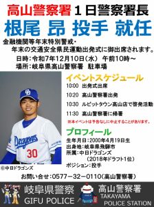 イベントでは、中日ドラゴンズの根尾投手が1日警察署長を務めるそうです。
